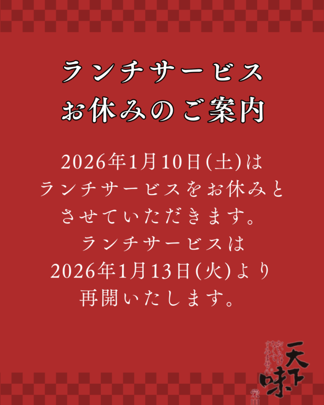 【ランチサービス】お休みのお知らせ【2026/1/10(土)】